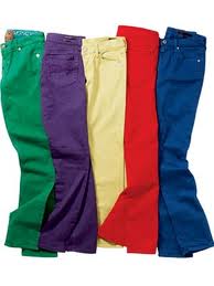 - Pants in bold brights or prints. Pair them with something subdued and tonal on the top.